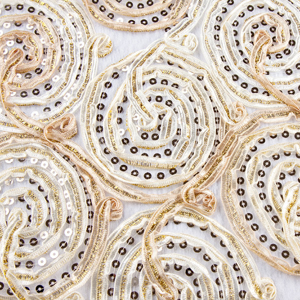 Sequined Ribbons is a beautiful fabric that features a sheer base topped with intertwining circular sequins and multicolored ribbons.