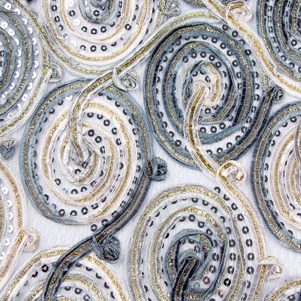 Sequined Ribbons is a beautiful fabric that features a sheer base topped with intertwining circular sequins and multicolored ribbons.