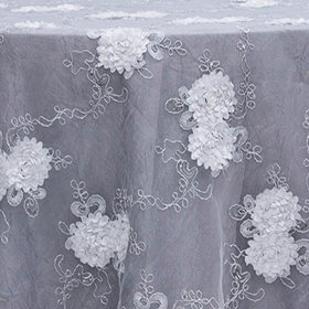 Vintage Veil is a stunning sheer fabric that features an intricate floral and ribbon design with touches of sequins. It is sure to add a romantic touch to any table!
