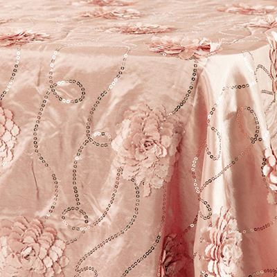 Our Rosette Sequin Linen rentals are the perfect way to add a touch of sparkle while still being affordable. These tablecloths feature a taffeta linen crafted with a sequin and raised rose design.