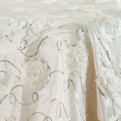 Our Rosette Sequin Linen rentals are the perfect way to add a touch of sparkle while still being affordable. These tablecloths feature a taffeta linen crafted with a sequin and raised rose design.