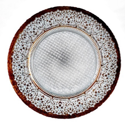 This charger is made of glass and is approximately 13″ in diameter